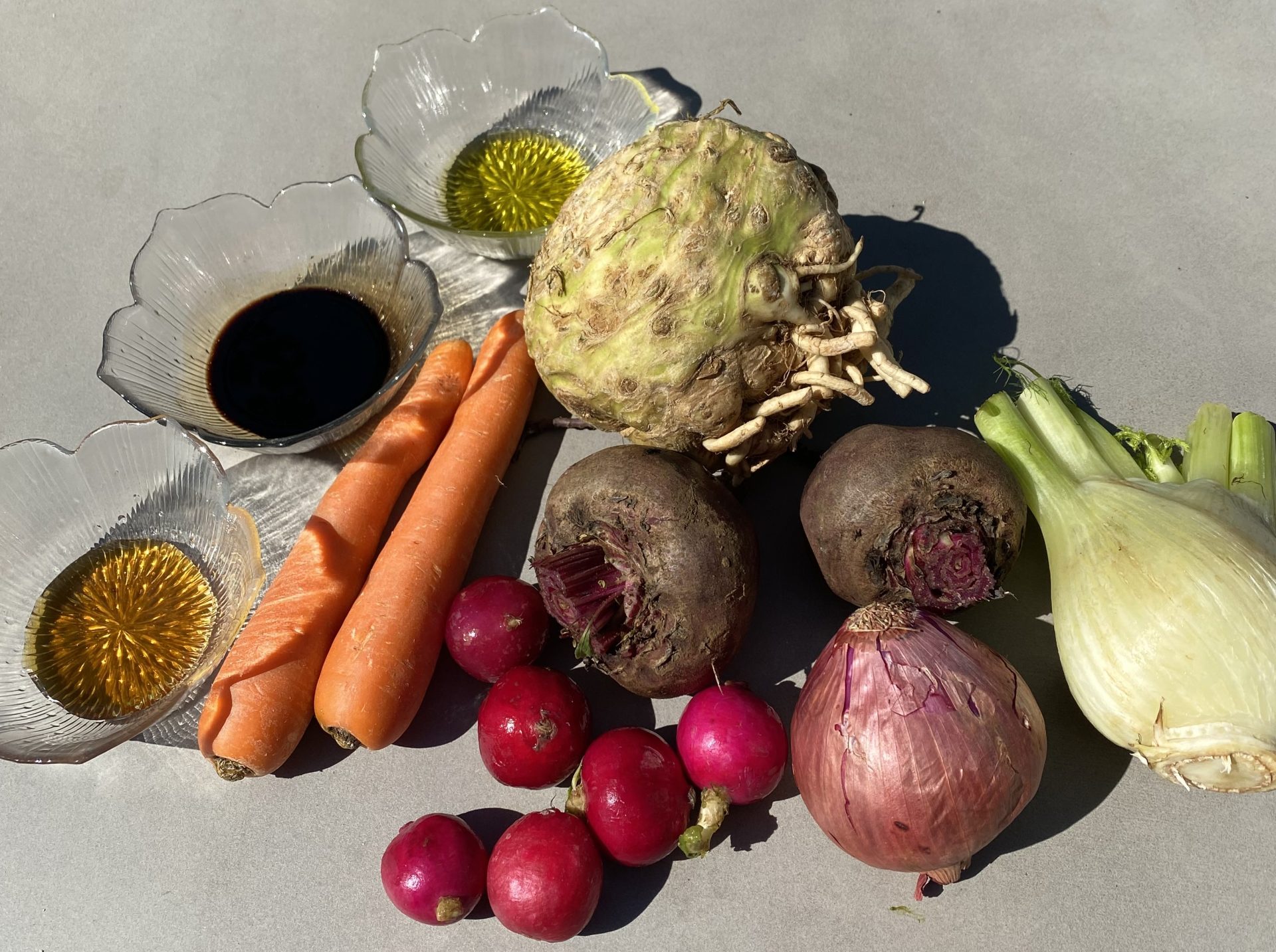 - Slice the cucumber horizontally in thin slices and place then next to each other on a pan