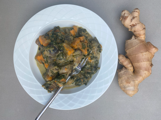 - Σε ένα μπολ ανακατεύουμε το γιαούρτι, τα φύλλα βασιλικού και τα μπαχαρικά