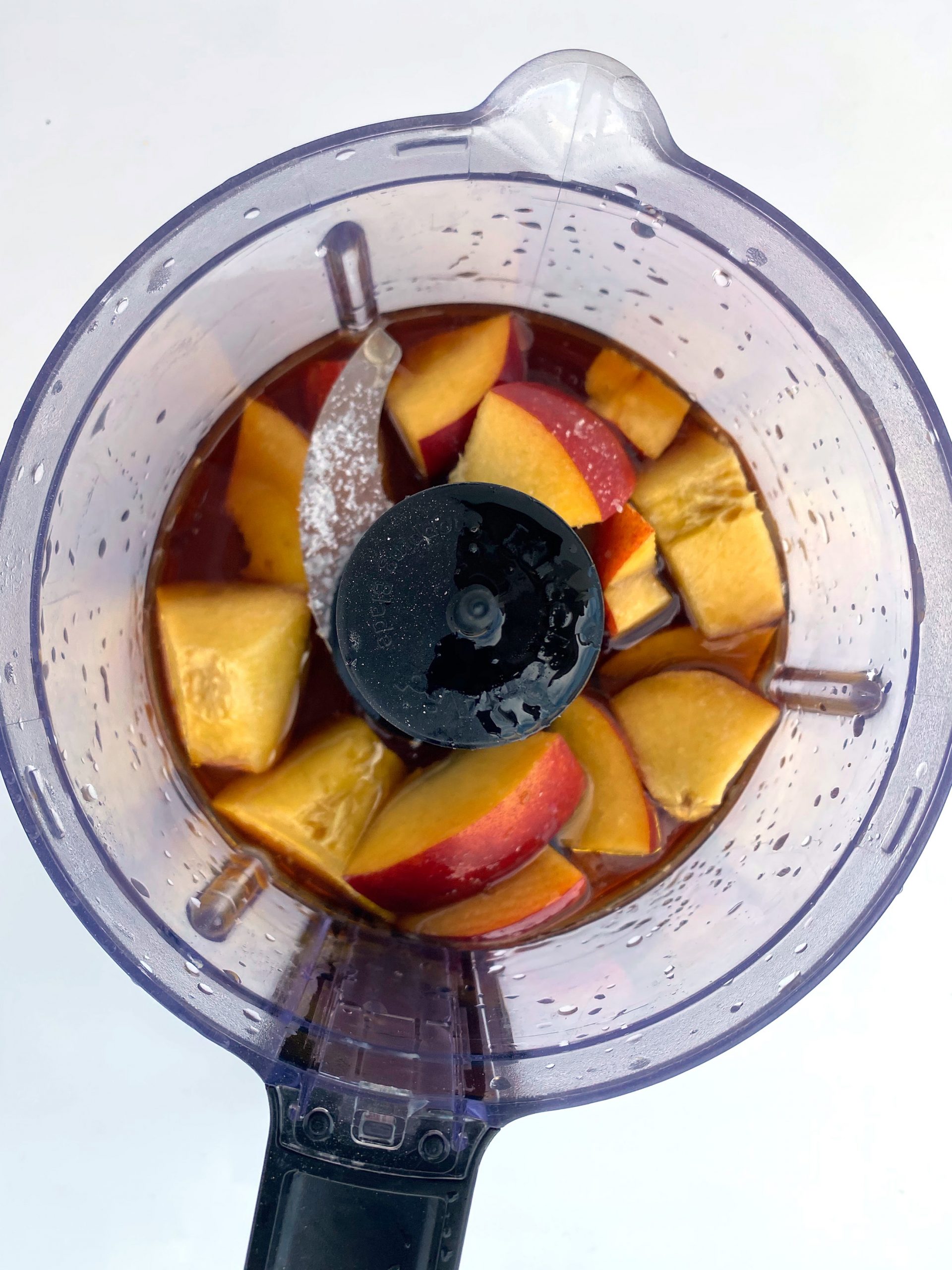 - Πλένουμε το ραδάκινο και το βάζουμε μαζί με τα υπόλοιπα υλικά του dressing στον πολυκόφτη